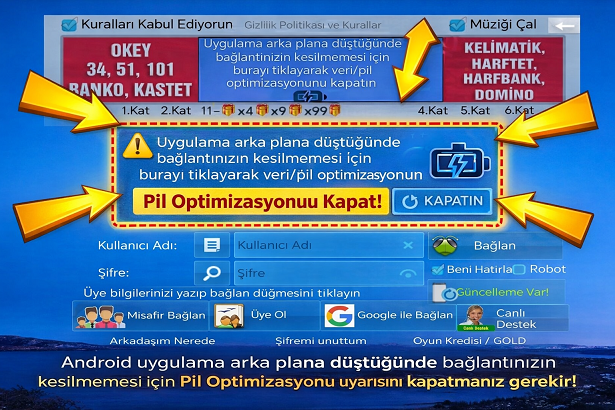 Android sistemi uygulama arka plana düştüğünde pil harcamasın diye bağlantıyı keser. Bunu önlemek için oyun açıldığında bağlantı penceresinde Pil Optimizasyonu uyarısı varsa onu kapatmanız gerekir.